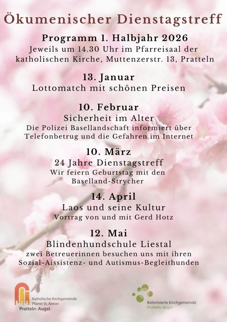 Der Dienstagstreff ist ein ökumenisches Angebot der kath. Pfarrei und der ref. Kirchgemeinde für alle Seniorinnen und Senioren aus Pratteln und Augst. Es gibt ein abwechslungsreiches Programm.